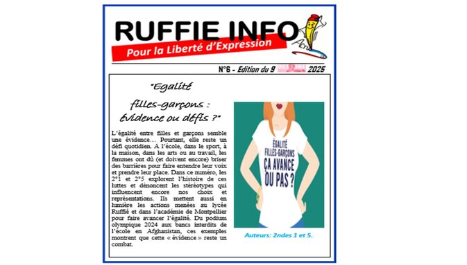 Les élèves de 2°1 et 2°5 ont créé ce journal pour montrer que l’égalité filles-garçons reste un défi en France et dans le monde. Ils présentent l’histoire des luttes, les stéréotypes et les actions du lycée Ruffié et de l’académie pour la promouvoir.